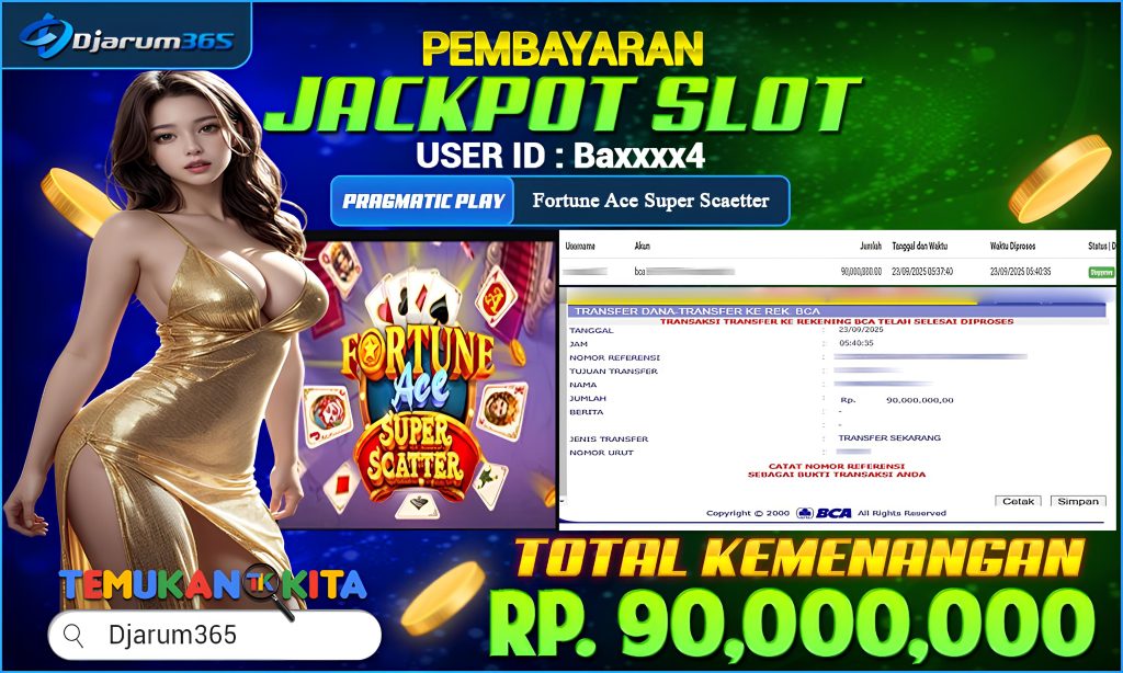 PEMBAYARAN KEMENANGAN RP. 90,000,000 KEMENANGAN BERAPAPUN PASTI DIBAYAR – Kami dari pihak Djarum365 ingin juga menyampaikan selamat kepada User Id : Baxxxx4 mendapatkan kemenangan pada FORTUNE ACE SUPER SCATTER dengan Total kemenangan sebesar Rp.90,000,000 Slot Indonesia Terpercaya ini terus memberikan peluang besar bagi para pemain untuk meraih kemenangan serupa! Dengan kemenangan itu pihak DJARUM365 juga langsung melakukan pembayaran dan withdraw yang sudah di lakukan oleh member dalam waktu secepatnya tanpa harus menunggu lama !!