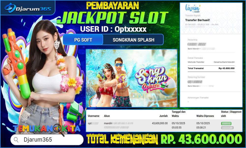 PEMBAYARAN KEMENANGAN RP. 43,600,000 KEMENANGAN BERAPAPUN PASTI DIBAYAR – Kami dari pihak Djarum365 ingin juga menyampaikan selamat kepada User Id : Optxxxxx mendapatkan kemenangan pada SONGKRAN SPLASH dengan Total kemenangan sebesar Rp.43,600,000 Slot Indonesia Terpercaya ini terus memberikan peluang besar bagi para pemain untuk meraih kemenangan serupa! Dengan kemenangan itu pihak DJARUM365 juga langsung melakukan pembayaran dan withdraw yang sudah di lakukan oleh member dalam waktu secepatnya tanpa harus menunggu lama !!