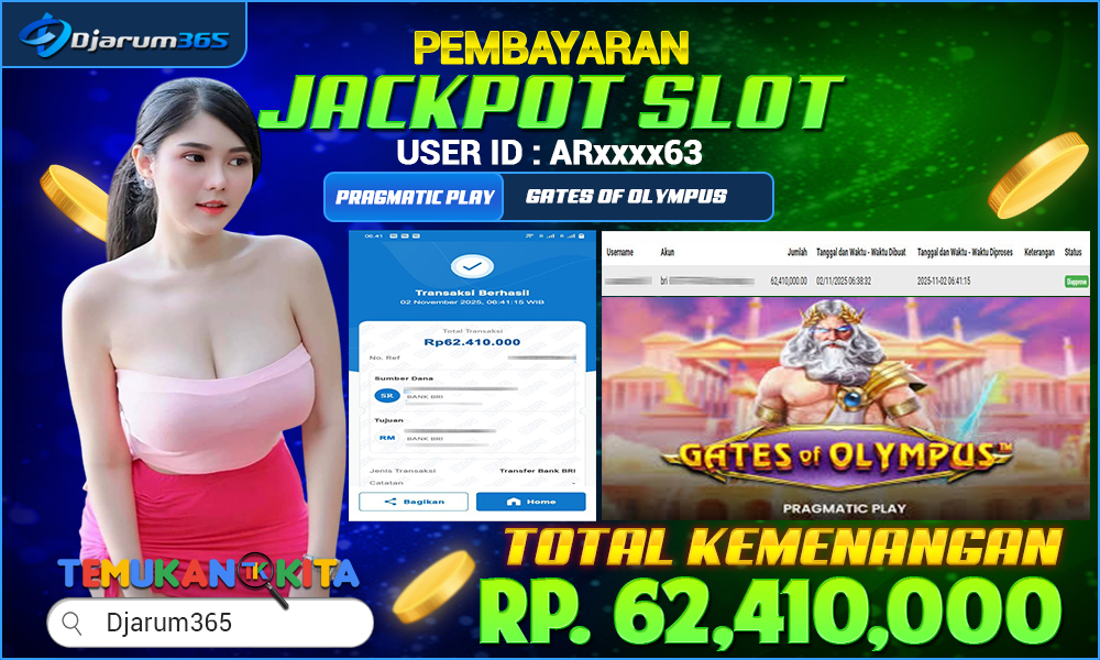 PEMBAYARAN KEMENANGAN RP.62,410,000 KEMENANGAN BERAPAPUN PASTI DIBAYAR – Kami dari pihak Djarum365 ingin juga menyampaikan selamat kepada User Id : Arxxxx63 mendapatkan kemenangan pada GATES OF OLYMPUS dengan Total kemenangan sebesar Rp.62,410,000 Slot Indonesia Terpercaya ini terus memberikan peluang besar bagi para pemain untuk meraih kemenangan serupa! Dengan kemenangan itu pihak DJARUM365 juga langsung melakukan pembayaran dan withdraw yang sudah di lakukan oleh member dalam waktu secepatnya tanpa harus menunggu lama !!