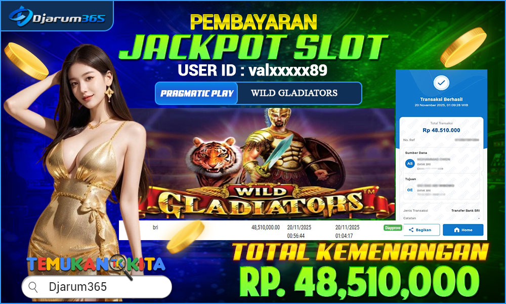 PEMBAYARAN KEMENANGAN RP,48,510,000 KEMENANGAN BERAPAPUN PASTI DIBAYAR – Kami dari pihak Djarum365 ingin juga menyampaikan selamat kepada User Id : valxxxxx89 mendapatkan kemenangan pada WILD GLADIATORS Total kemenangan sebesar Rp.48,510,000 Slot Indonesia Terpercaya ini terus memberikan peluang besar bagi para pemain untuk meraih kemenangan serupa! Dengan kemenangan itu pihak DJARUM365 juga langsung melakukan pembayaran dan withdraw yang sudah di lakukan oleh member dalam waktu secepatnya tanpa harus menunggu lama !!