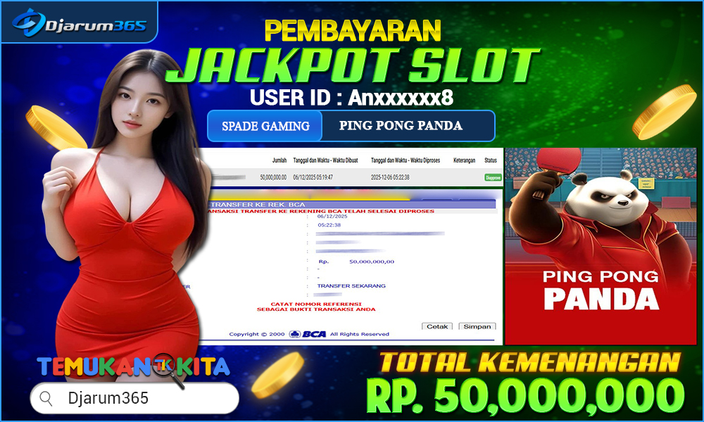 PEMBAYARAN KEMENANGAN RP 50,000,000 KEMENANGAN BERAPAPUN PASTI DIBAYAR – Kami dari pihak Djarum365 ingin juga menyampaikan selamat kepada User Id : Anxxxxxx88 mendapatkan kemenangan pada PING PONG PANDA Total kemenangan sebesar Rp 50,000,000 Slot Indonesia Terpercaya ini terus memberikan peluang besar bagi para pemain untuk meraih kemenangan serupa! Dengan kemenangan itu pihak DJARUM365 juga langsung melakukan pembayaran dan withdraw yang sudah di lakukan oleh member dalam waktu secepatnya tanpa harus menunggu lama !!