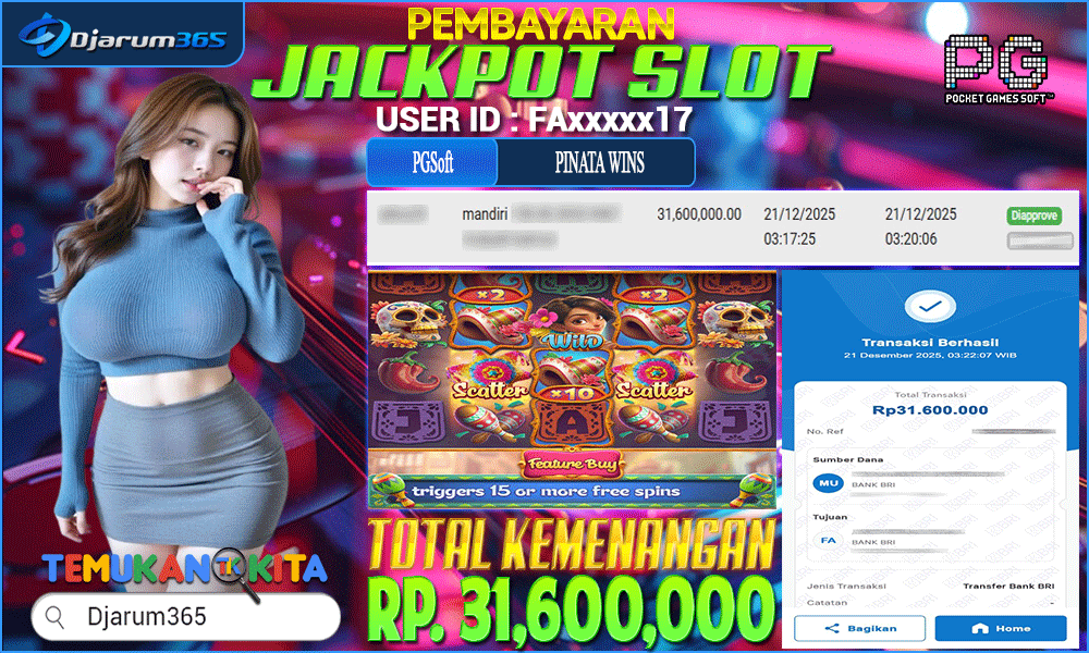PEMBAYARAN KEMENANGAN RP 31,600,000 KEMENANGAN BERAPAPUN PASTI DIBAYAR – Kami dari pihak Djarum365 ingin juga menyampaikan selamat kepada User Id : FAxxxxx17 mendapatkan kemenangan pada PG SOFT PINATA WINS Total kemenangan sebesar Rp 31,600,000 Slot Indonesia Terpercaya ini terus memberikan peluang besar bagi para pemain untuk meraih kemenangan serupa! Dengan kemenangan itu pihak DJARUM365 juga langsung melakukan pembayaran dan withdraw yang sudah di lakukan oleh member dalam waktu secepatnya tanpa harus menunggu lama !!