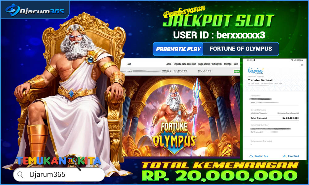 PEMBAYARAN KEMENANGAN RP 20,000,000 KEMENANGAN BERAPAPUN PASTI DIBAYAR – Kami dari pihak Djarum365 ingin juga menyampaikan selamat kepada User Id : berxxxxxx3 mendapatkan kemenangan pada FORTUNE OF OLYMPUS Total kemenangan sebesar Rp 20,000,000 Slot Indonesia Terpercaya ini terus memberikan peluang besar bagi para pemain untuk meraih kemenangan serupa! Dengan kemenangan itu pihak DJARUM365 juga langsung melakukan pembayaran dan withdraw yang sudah di lakukan oleh member dalam waktu secepatnya tanpa harus menunggu lama !!