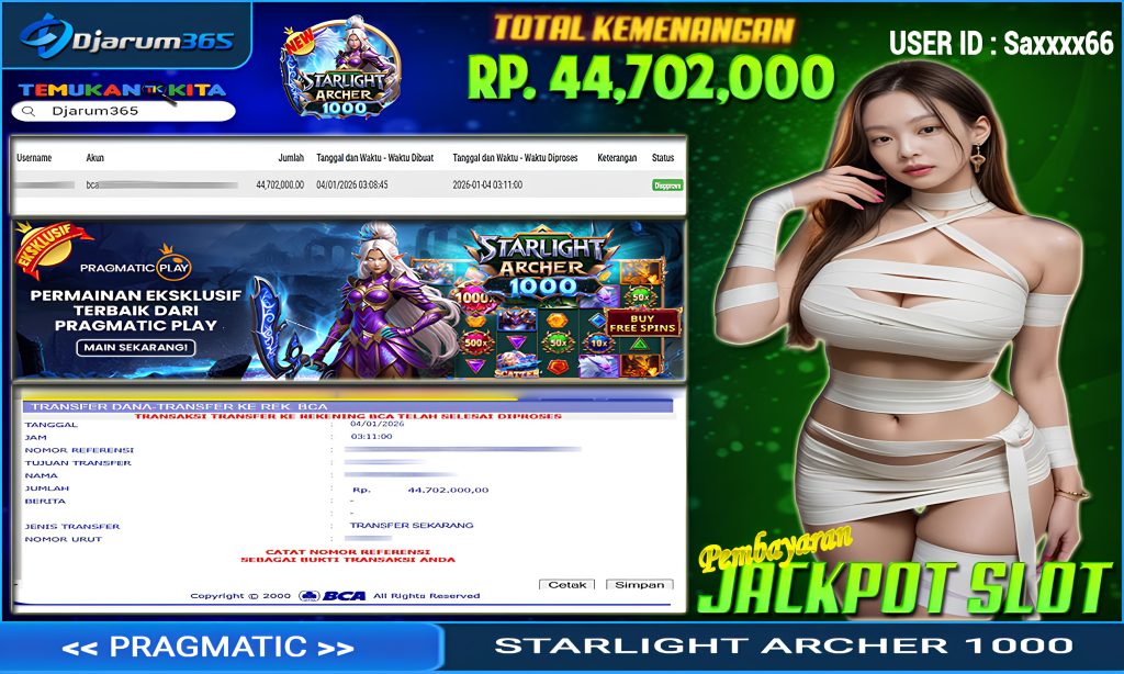 PEMBAYARAN KEMENANGAN RP 44,702,000 KEMENANGAN BERAPAPUN PASTI DIBAYAR – Kami dari pihak Djarum365 ingin juga menyampaikan selamat kepada User Id : Saxxxx66 mendapatkan kemenangan pada STARLIGHT ARCHER 1000 Total kemenangan sebesar Rp 44,702,000 Slot Indonesia Terpercaya ini terus memberikan peluang besar bagi para pemain untuk meraih kemenangan serupa! Dengan kemenangan itu pihak DJARUM365 juga langsung melakukan pembayaran dan withdraw yang sudah di lakukan oleh member dalam waktu secepatnya tanpa harus menunggu lama !!