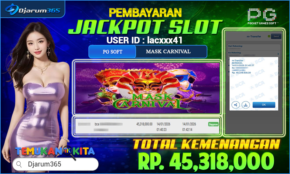 PEMBAYARAN KEMENANGAN RP 45,318,000 KEMENANGAN BERAPAPUN PASTI DIBAYAR – Kami dari pihak Djarum365 ingin juga menyampaikan selamat kepada User Id : lacxxx41 mendapatkan kemenangan pada MASK CARNIVAL Total kemenangan sebesar Rp 45,318,000 Slot Indonesia Terpercaya ini terus memberikan peluang besar bagi para pemain untuk meraih kemenangan serupa! Dengan kemenangan itu pihak DJARUM365 juga langsung melakukan pembayaran dan withdraw yang sudah di lakukan oleh member dalam waktu secepatnya tanpa harus menunggu lama !!