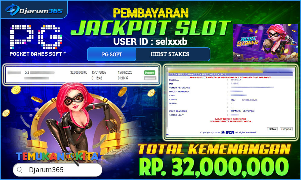 PEMBAYARAN KEMENANGAN RP 32,000,000 KEMENANGAN BERAPAPUN PASTI DIBAYAR – Kami dari pihak Djarum365 ingin juga menyampaikan selamat kepada User Id : selxxxb mendapatkan kemenangan pada HEIST STAKES Total kemenangan sebesar Rp 32,000,000 Slot Indonesia Terpercaya ini terus memberikan peluang besar bagi para pemain untuk meraih kemenangan serupa! Dengan kemenangan itu pihak DJARUM365 juga langsung melakukan pembayaran dan withdraw yang sudah di lakukan oleh member dalam waktu secepatnya tanpa harus menunggu lama !!