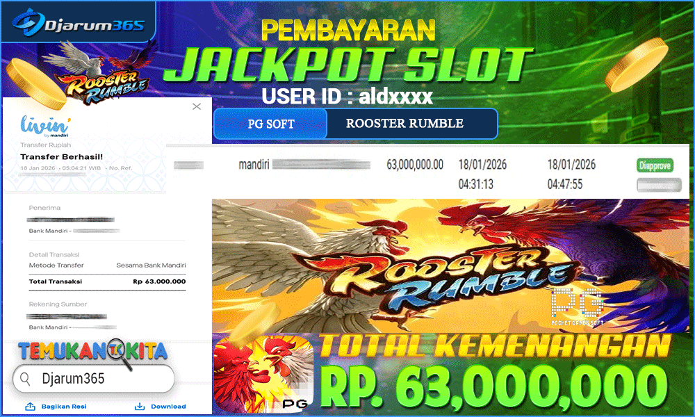 PEMBAYARAN KEMENANGAN RP 63,000,000 KEMENANGAN BERAPAPUN PASTI DIBAYAR – Kami dari pihak Djarum365 ingin juga menyampaikan selamat kepada User Id : aldxxxx mendapatkan kemenangan pada PG SOFT ROOSTER RUMBLE Total kemenangan sebesar Rp 63,000,000 Slot Indonesia Terpercaya ini terus memberikan peluang besar bagi para pemain untuk meraih kemenangan serupa! Dengan kemenangan itu pihak DJARUM365 juga langsung melakukan pembayaran dan withdraw yang sudah di lakukan oleh member dalam waktu secepatnya tanpa harus menunggu lama !!