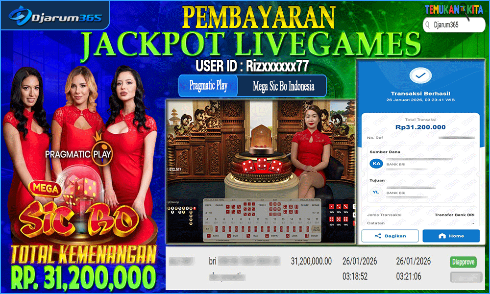 PEMBAYARAN KEMENANGAN RP 31,200,000 KEMENANGAN BERAPAPUN PASTI DIBAYAR – Kami dari pihak Djarum365 ingin juga menyampaikan selamat kepada User Id : Rizxxxxx77 mendapatkan kemenangan Mega Sic Bo Indonesia Total kemenangan sebesar Rp 31,200,000 Slot Indonesia Terpercaya ini terus memberikan peluang besar bagi para pemain untuk meraih kemenangan serupa! Dengan kemenangan itu pihak DJARUM365 juga langsung melakukan pembayaran dan withdraw yang sudah di lakukan oleh member dalam waktu secepatnya tanpa harus menunggu lama !!