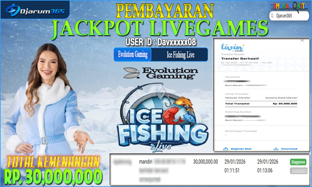 PEMBAYARAN KEMENANGAN RP 30,000,000 KEMENANGAN BERAPAPUN PASTI DIBAYAR – Kami dari pihak Djarum365 ingin juga menyampaikan selamat kepada User Id : Davxxxxx08 mendapatkan kemenangan Ice Fishing Live Total kemenangan sebesar Rp 30,000,000 Slot Indonesia Terpercaya ini terus memberikan peluang besar bagi para pemain untuk meraih kemenangan serupa! Dengan kemenangan itu pihak DJARUM365 juga langsung melakukan pembayaran dan withdraw yang sudah di lakukan oleh member dalam waktu secepatnya tanpa harus menunggu lama !!