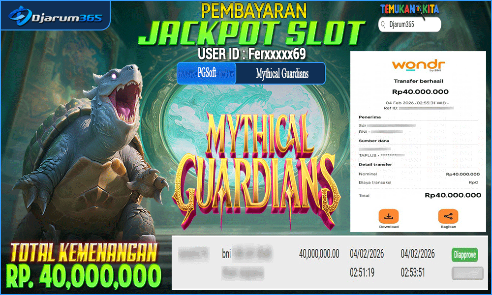 PEMBAYARAN KEMENANGAN RP 40,000,000 KEMENANGAN BERAPAPUN PASTI DIBAYAR – Kami dari pihak Djarum365 ingin juga menyampaikan selamat kepada User Id : Ferxxxxx69 mendapatkan kemenangan pada Mythical Guardians Total kemenangan sebesar Rp 40,000,000 Slot Indonesia Terpercaya ini terus memberikan peluang besar bagi para pemain untuk meraih kemenangan serupa! Dengan kemenangan itu pihak DJARUM365 juga langsung melakukan pembayaran dan withdraw yang sudah di lakukan oleh member dalam waktu secepatnya tanpa harus menunggu lama !!