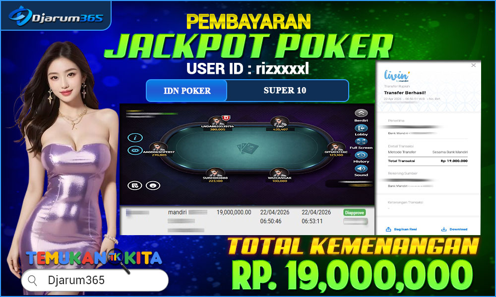 PEMBAYARAN KEMENANGAN RP 19,000,000 Slot Indonesia KEMENANGAN BERAPAPUN PASTI DIBAYAR – Kami dari pihak Djarum365 ingin juga menyampaikan selamat kepada User Id : rizxxxxl mendapatkan kemenangan pada SUPER 10 Total kemenangan sebesar Rp 19,000,000 Slot Indonesia Terpercaya ini terus memberikan peluang besar bagi para pemain untuk meraih kemenangan serupa! Dengan kemenangan itu pihak DJARUM365 juga langsung melakukan pembayaran dan withdraw yang sudah di lakukan oleh member dalam waktu secepatnya tanpa harus menunggu lama !!